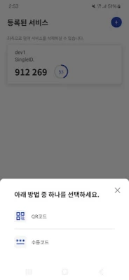 * 처음 앱 이용 시 SingleID 웹의 추가인증 화면에 나타난 QR을 스캔하거나 또는 서비스 등록코드를 입력하여 서비스를 등록하세요.
